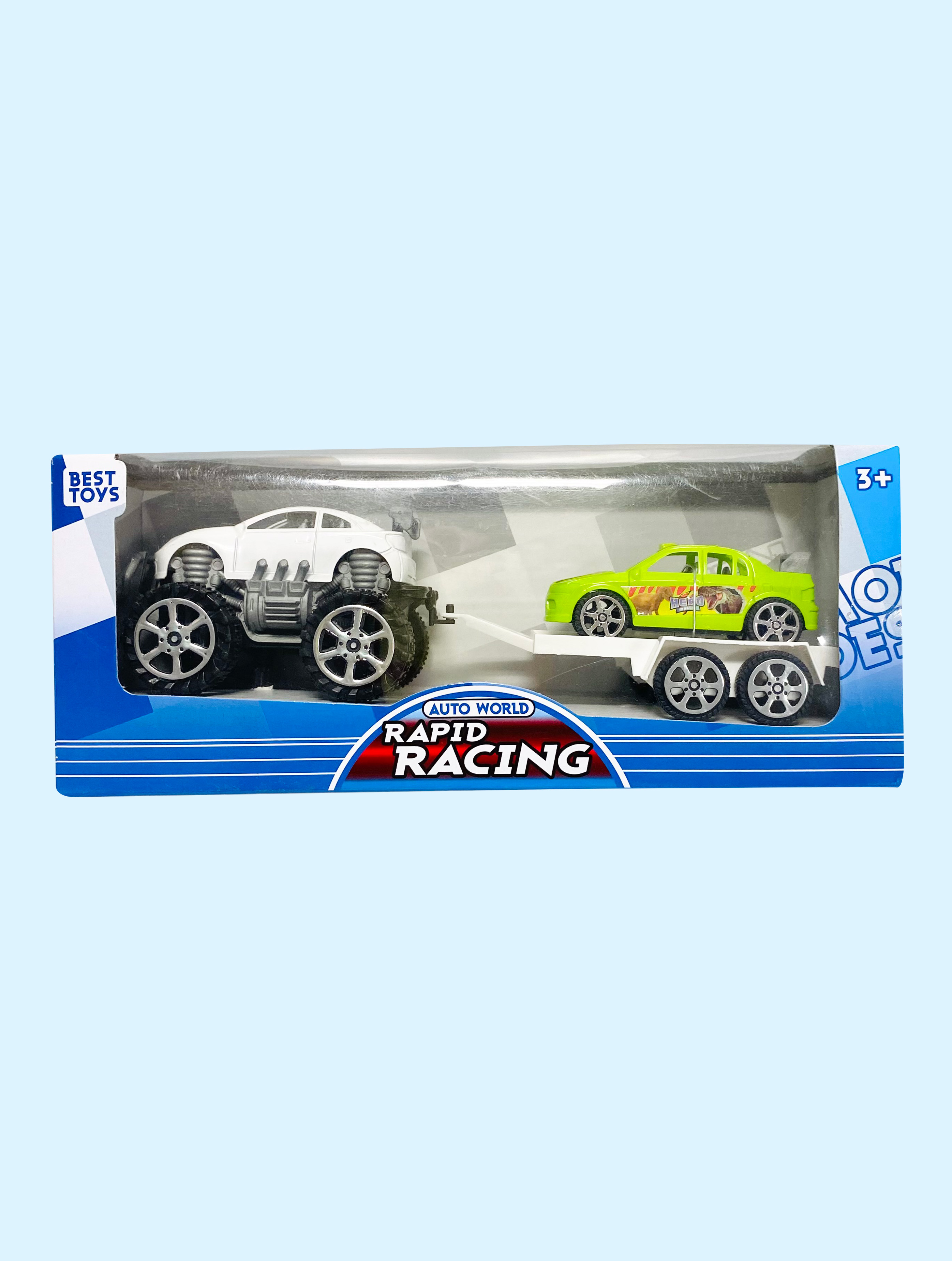 CAMIONETA MONSTER CON REMOLQUE Y VEHÍCULO MATERIAL PLÁSTICO EN CAJA